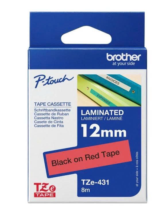 Brother TZe-431, khổ 12mm, dài 8m, Black on Red, chống thấm nước