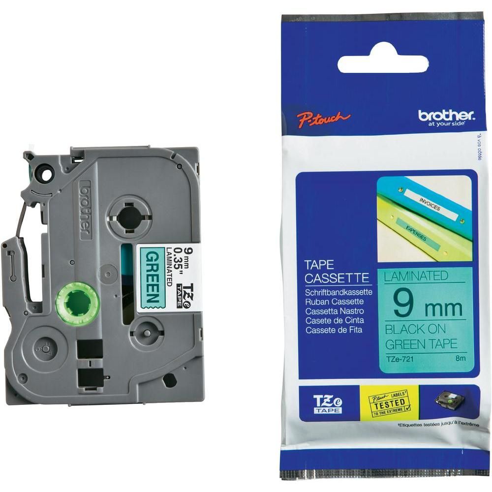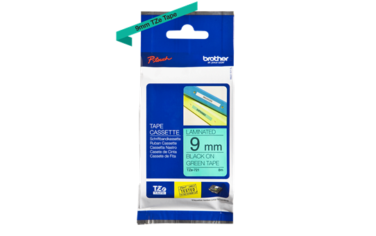 Brother TZe-721, khổ 9mm, dài 8m, Black on Green, chống thấm nước