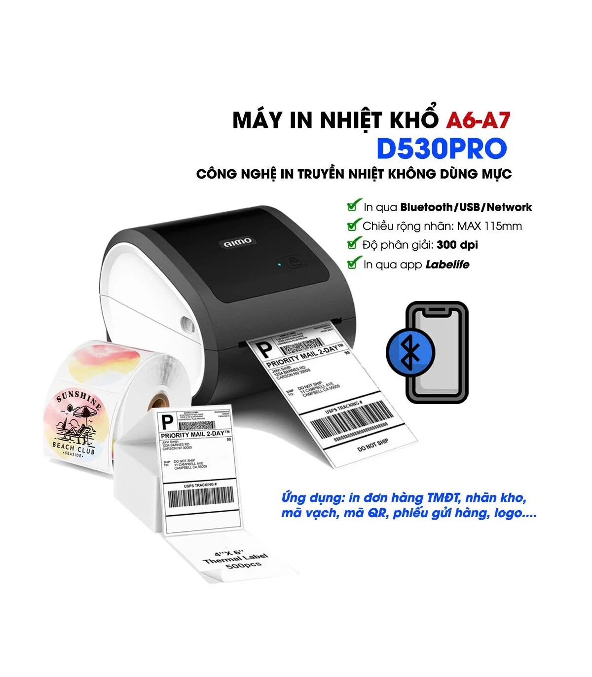 Máy In Tem Nhãn AIMO D530 Pro 300dpi, Bluetooth - In Tem Shopee, In Mã Vạch, In Tem Phụ