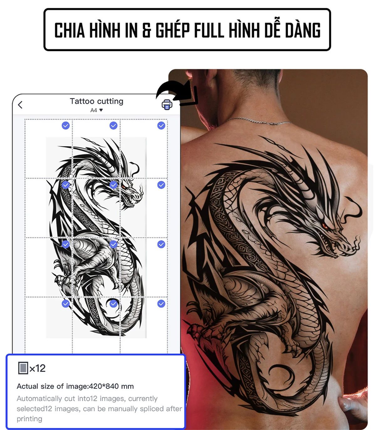 Thêm chức năng cắt hình ảnh để in khuôn hình xăm lớn, có thể in và sao chép thiết kế hình xăm lớn của bạn lên da một cách hoàn hảo mà không gặp lỗi.