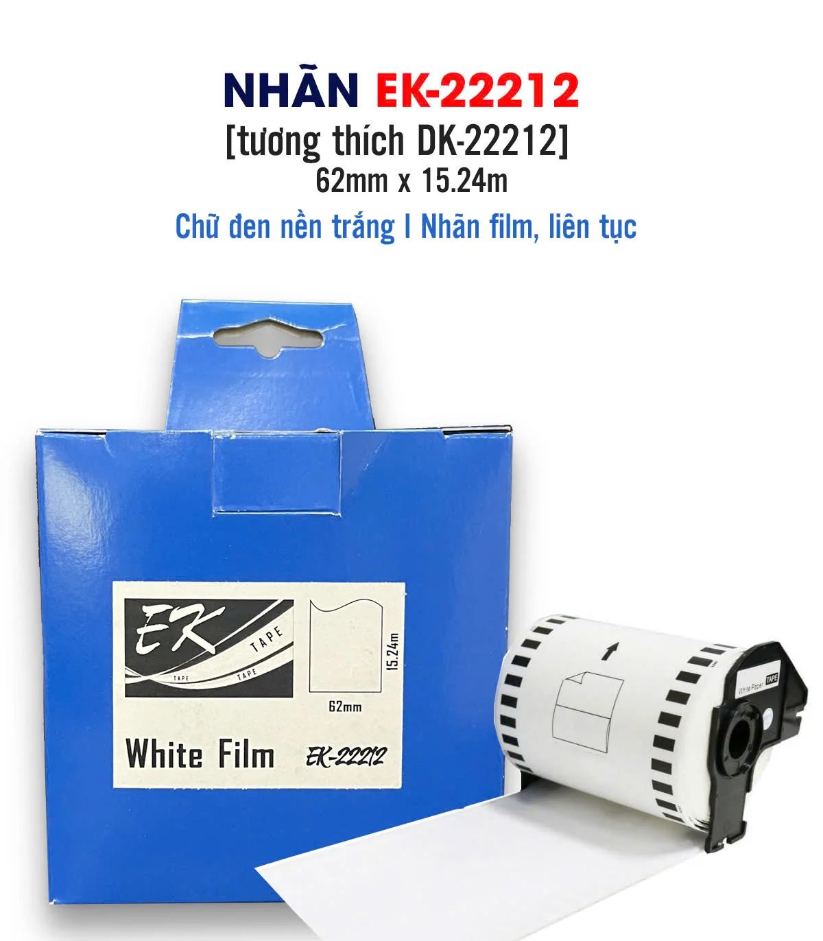 Nhãn film nhựa màu trắng EK-22212 (DK-22212), chống nước, 62mm x 15m (liên tục), tương thích DK-22212