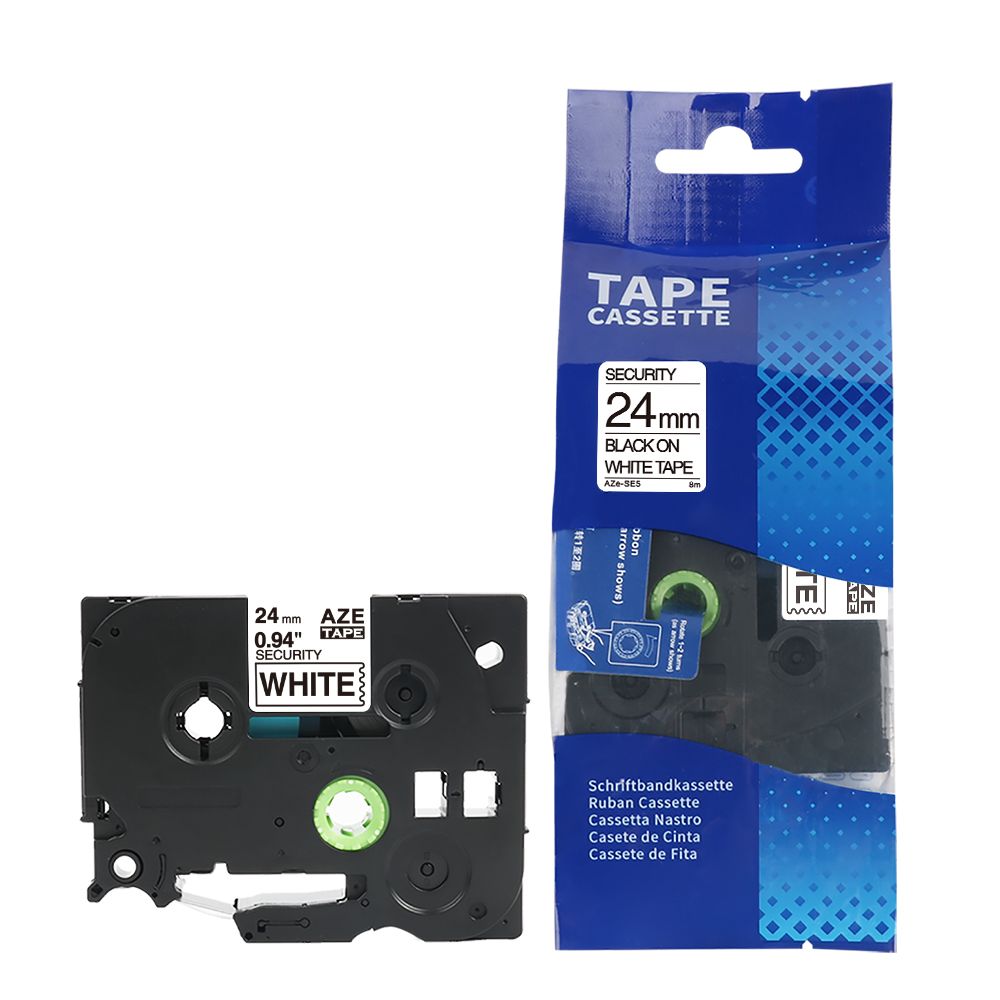 Nhãn in HZe-SE5 (TZe-SE5, TZ2-SE5), 24mm x 8m, Black on White, Nhãn an ninh